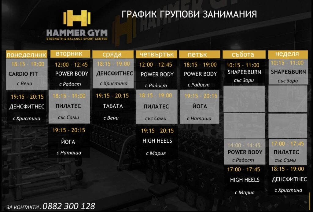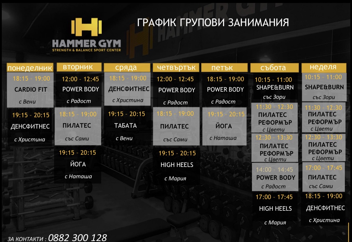 Груповите занимания във фитнес Hammer Gym включват разнообразни кардио тренировки, силови тренировки, йога, пилатес, zumba и други. При нас Груповите занимания предоставят социален аспект, като създават общност и мотивация сред присъстващите.